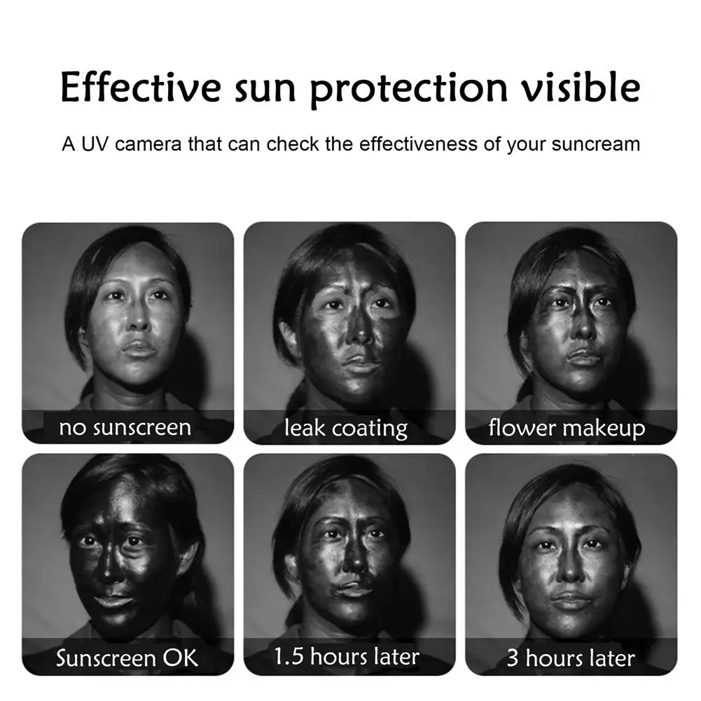 CÂMERA UV: Uma câmera UV que pode verificar a eficácia do seu protetor solar. Ao conectar a câmera Smart UV ao seu smartphone, você pode ver a eficácia do seu protetor solar. O protetor solar bem-sucedido mostrará uma tela preta e branca mais escura.